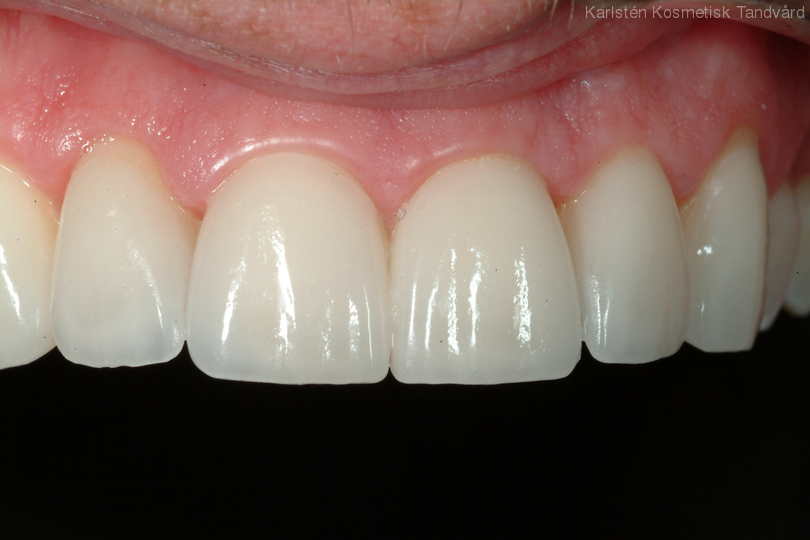 Sneda och roterade tänder rätades ut och gjordes mer symmetriska. Behandling: Generell blekning samt 6 fasader.