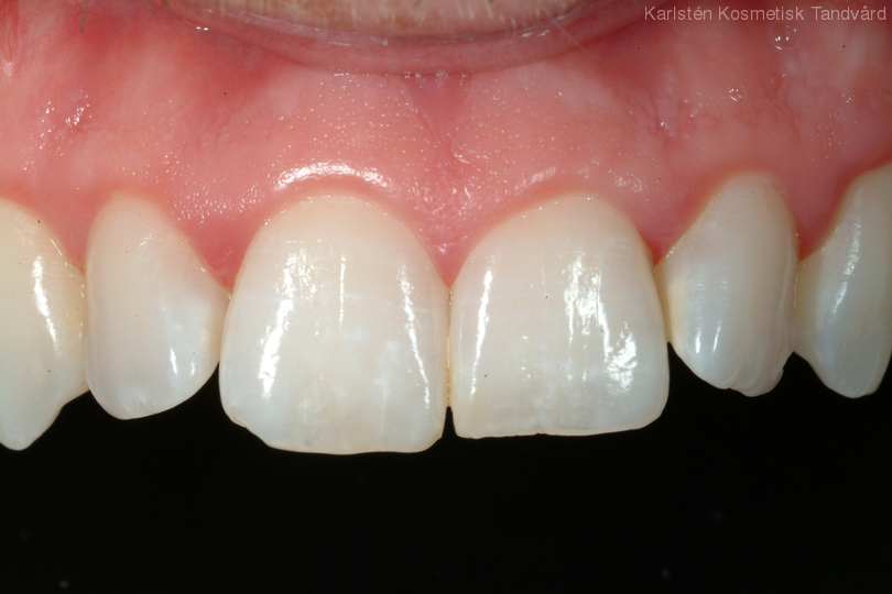 Sneda och roterade tänder rätades ut och gjordes mer symmetriska. Behandling: Generell blekning samt 6 fasader.