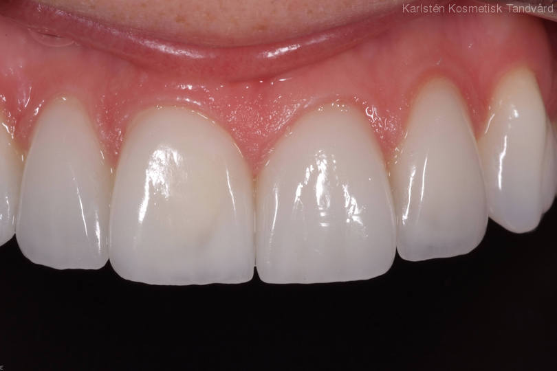 Oregelbunden tandrad i både över- och underkäken. Behandling: Generell blekning samt 5 fasader uppe och 5 fasader nere.