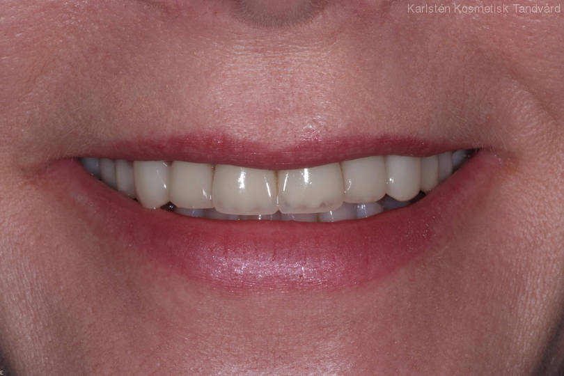 Fasader utförda som inte kändes bra. Visst instabilt bett. Behandling: 12 porslinskronor i överkäken och 4 i underkäken medförde ett nytt utseende samt ett bett i balans.