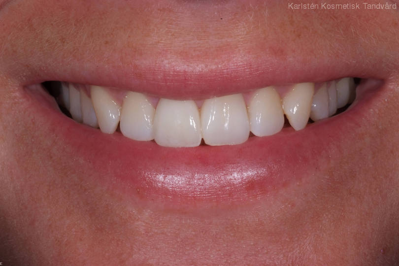 1 framtand står snett bakom den andra i tandbågen samt är skadad sedan tidigare. Patienten har dessutom en hel del huvudvärk. Behandling: 1 tandfasad utbyggd i tandbågen och bettkorrigering har lett till ett stabilt bett med betydligt mindre huvudvärk.