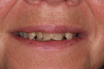 Kraftig trångställning och missfärgade tänder. Behandling: Generell blekning och 6 fasader i överkäken.