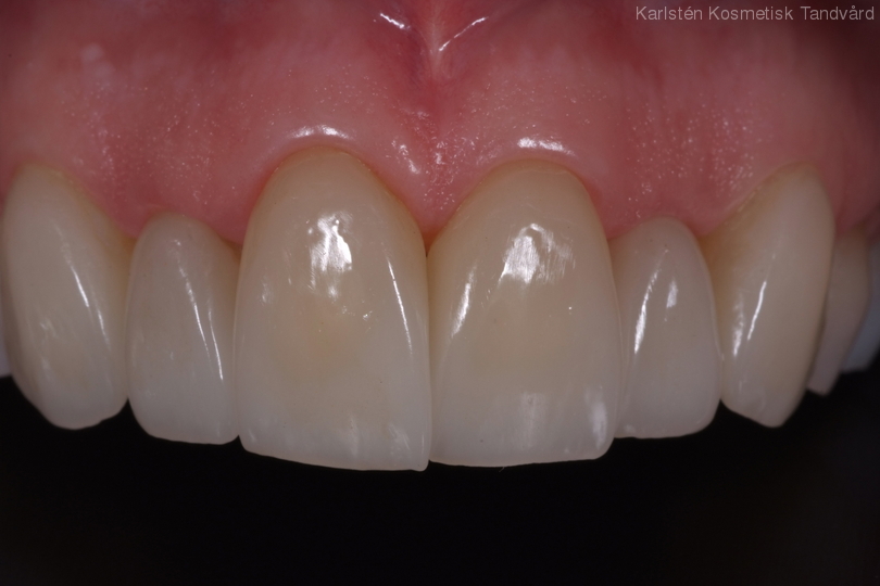 Kraftig trångställning och missfärgade tänder. Behandling: Generell blekning och 6 fasader i överkäken.