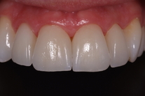 Missfärgade, trasiga framtänder. Behandling: Generell blekning samt 4 fasader.