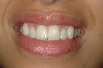 Mycket oregelbunden tandposition och trångställda tänder. Behandling: Generell blekning samt 6 fasader.