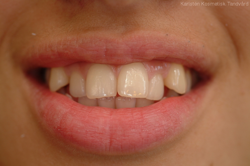 Mycket oregelbunden tandposition och trångställda tänder. Behandling: Generell blekning samt 6 fasader.