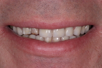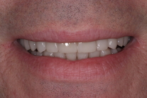 Gamla fasader som inte fungerar i bettet samt lossnar. Behandling: 28 tänder uppbyggda i en korrekt position samt höjning av bettet.