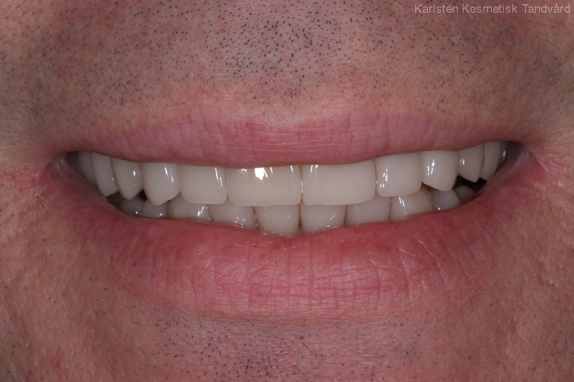 Gamla fasader som inte fungerar i bettet samt lossnar. Behandling: 28 tänder uppbyggda i en korrekt position samt höjning av bettet.