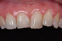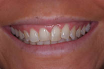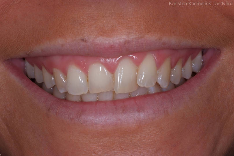 Trångställda och slitna framtänder. Behandling: Generell blekning, bettkorrigering samt laserkonturering av tandköttet och 5 fasader.