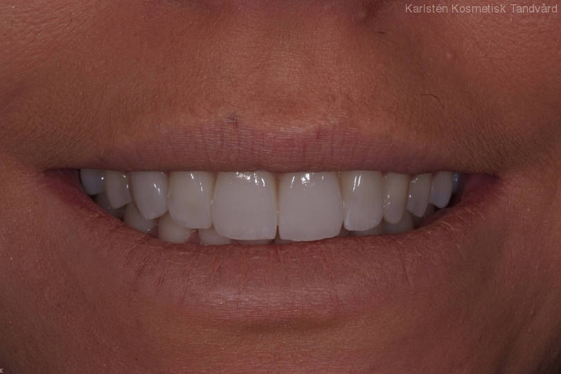Trångställda och slitna framtänder. Behandling: Generell blekning, bettkorrigering samt laserkonturering av tandköttet och 5 fasader.