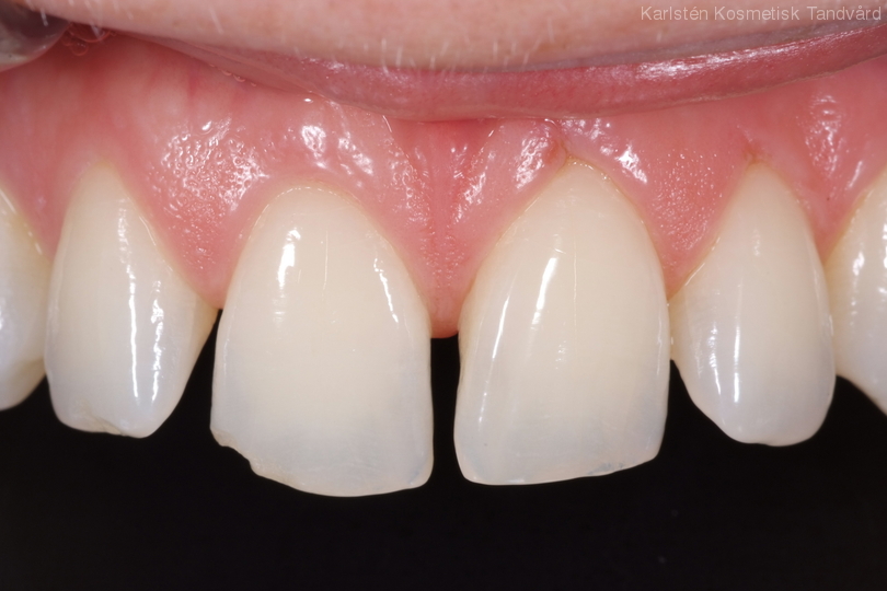 Glesa tänder som pekar åt olika håll samt är något skadade. Behandling: Generell blekning samt 4 fasader.