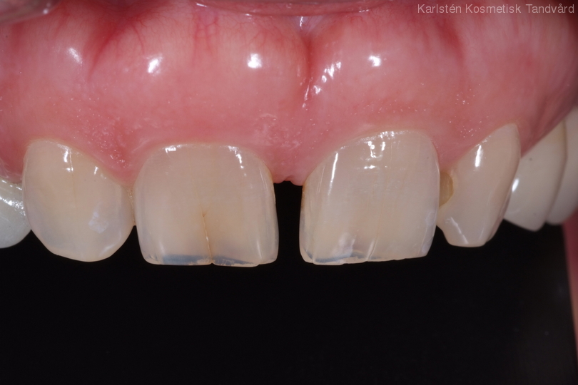 Missnöjd med glesa och slitna framtänder. Behandling: Generell blekning, laserkonturering av tandköttet samt 4 fasader och 1 krona.