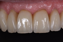 Kraftigt slitet och gnisslat bett. Behandling: 10 porslinskronor i överkäken.