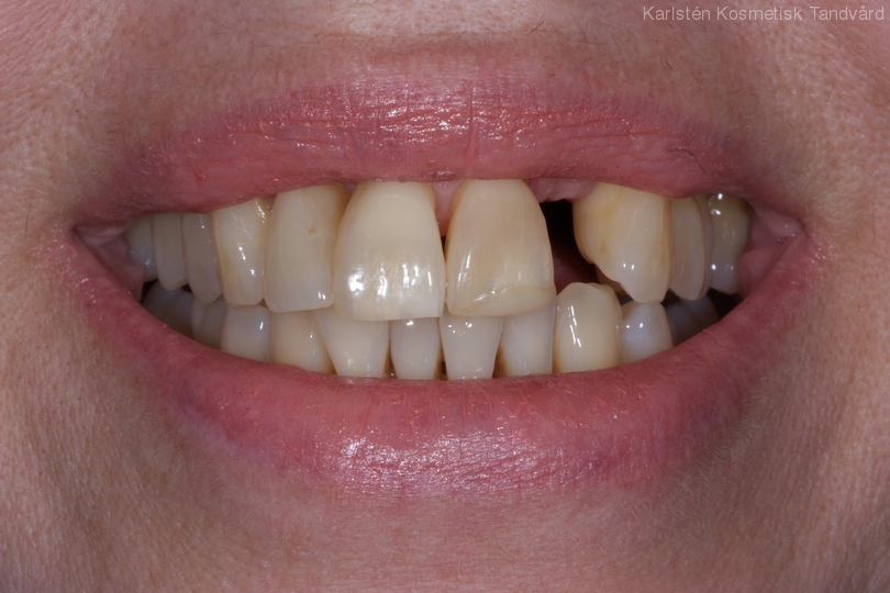 Missnöje med stora mellanrum och färg samt 1 saknad tand. Behandling: Generell blekning samt 2 kronor och 1 bro på 4 tänder i överkäken.