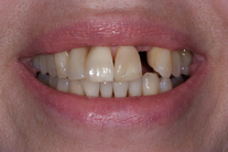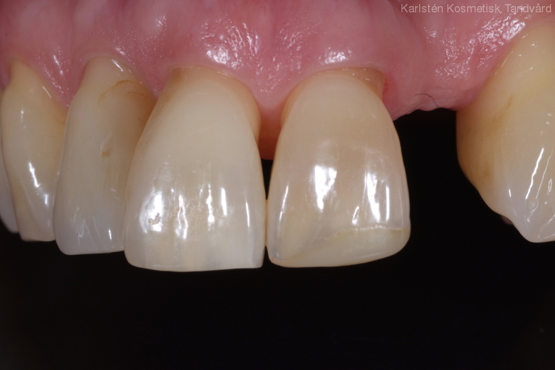 Missnöje med stora mellanrum och färg samt 1 saknad tand. Behandling: Generell blekning samt 2 kronor och 1 bro på 4 tänder i överkäken.