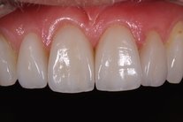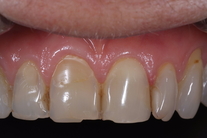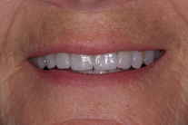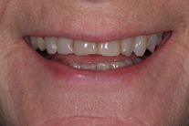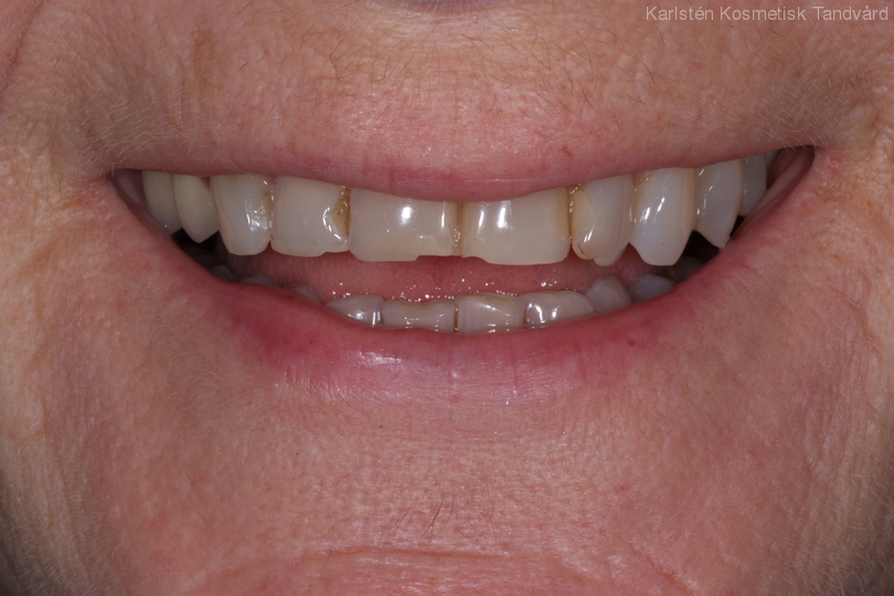 Slitna tänder med fyllningar och missfärgningar. Behandling: Generell blekning, 2 kronor på höger sida samt 4 fasader.