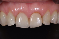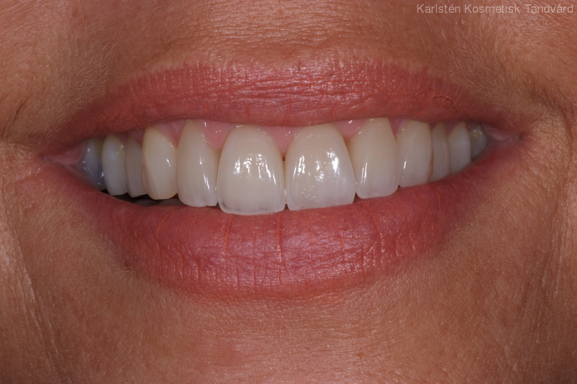 2 gamla kronor som inte stämmer riktigt i form samt oregelbunden tandrad. Behandling: Generell blekning samt 5 porslinskronor.