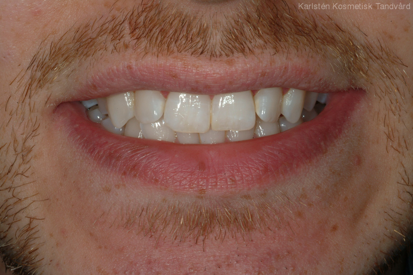 Sneda och roterade tänder rätades ut och gjordes mer symmetriska. Behandling: Generell blekning samt 6 fasader.