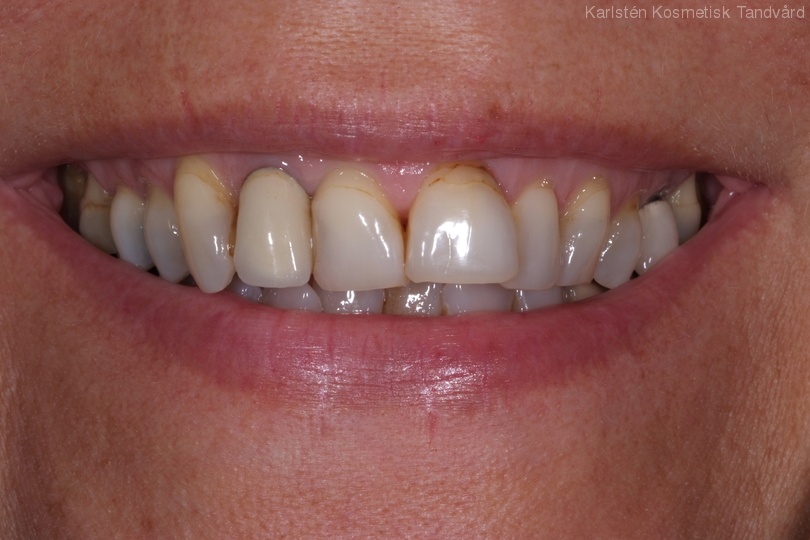 Missfärgade framtänder som är olika stora och har olika färg. Behandling: Generell blekning, laserkonturering av tandköttet, 2 compositefyllningar på hörntänderna samt 4 kronor.