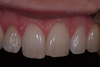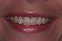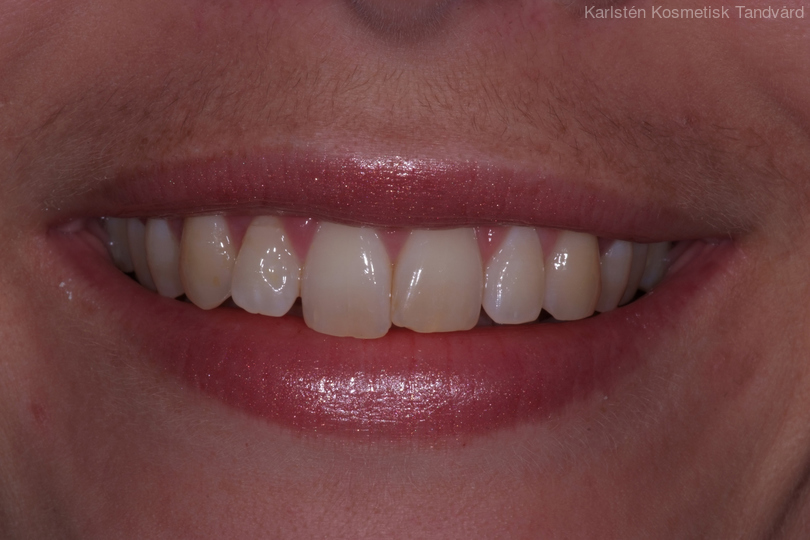 30-årig kvinna med frakturerad framtand med infektion som måste tas bort. Behandlingen bestod av generell blekning, implantat med ben- och bindvävsuppbyggnad samt en implantatkrona