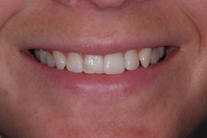 1 framtand står snett bakom den andra i tandbågen samt är skadad sedan tidigare. Patienten har dessutom en hel del huvudvärk. Behandling: 1 tandfasad utbyggd i tandbågen och bettkorrigering har lett till ett stabilt bett med betydligt mindre huvudvärk.