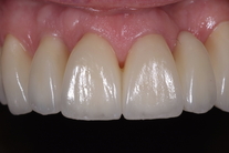 Missnöje med stora mellanrum och färg samt 1 saknad tand. Behandling: Generell blekning samt 2 kronor och 1 bro på 4 tänder i överkäken.