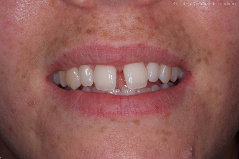 Stort mellanrum mellan framtänderna, ca 4 mm. Behandling: Generell blekning samt 4 fasader.