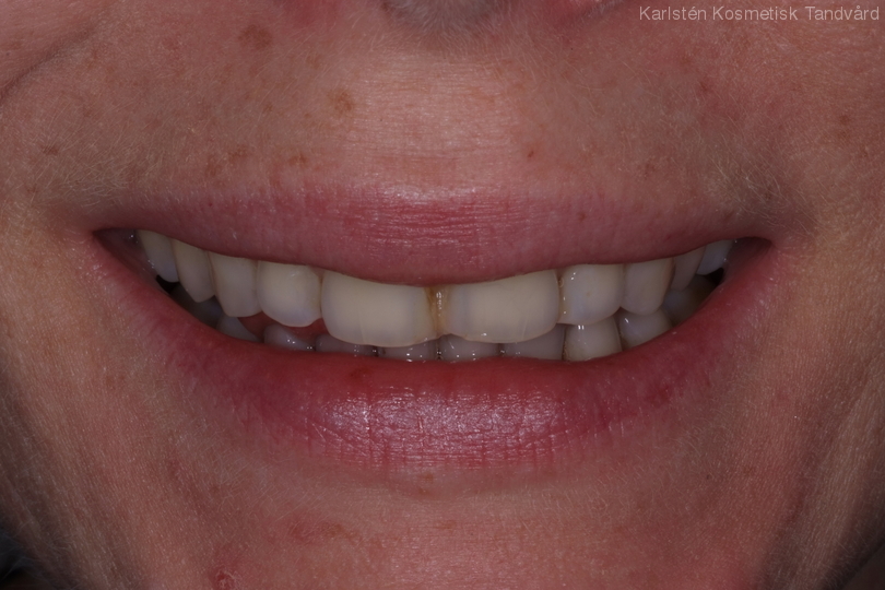 Kvinna som är missnöjd med sina framtänder. Behandling: Generell blekning samt 4 fasader.