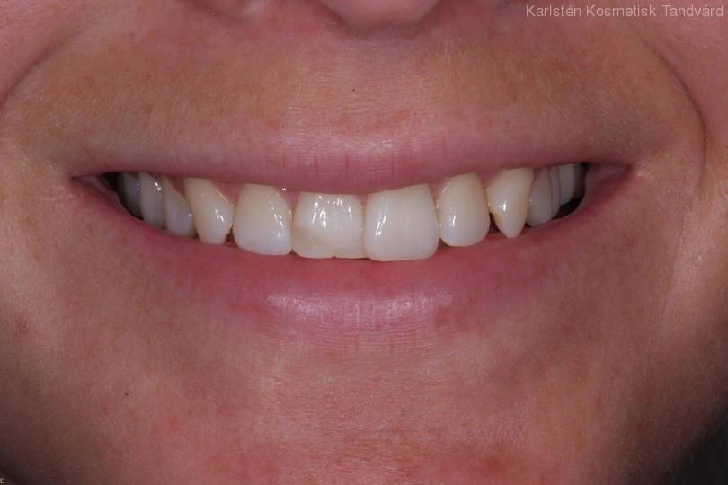 1 framtand står snett bakom den andra i tandbågen samt är skadad sedan tidigare. Patienten har dessutom en hel del huvudvärk. Behandling: 1 tandfasad utbyggd i tandbågen och bettkorrigering har lett till ett stabilt bett med betydligt mindre huvudvärk.