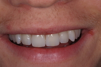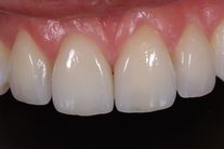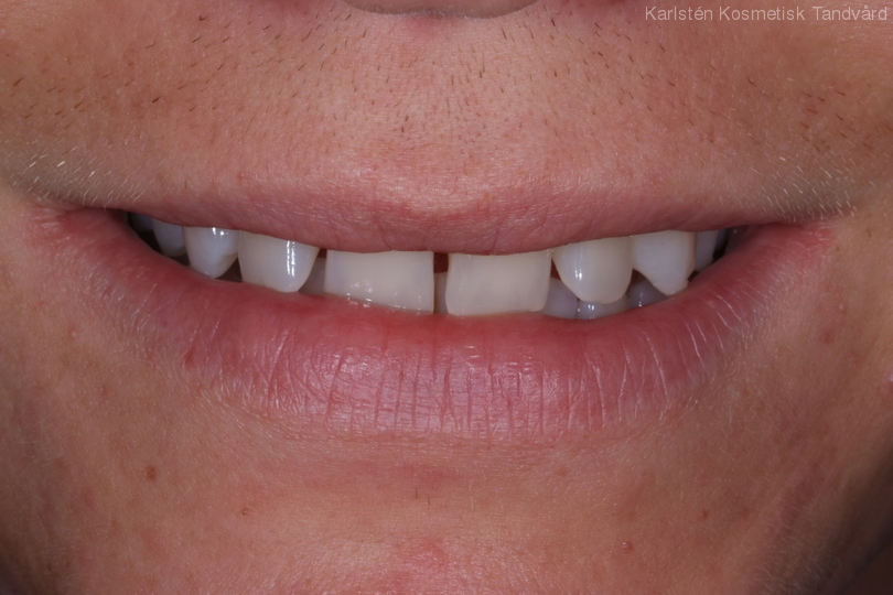 Glesa tänder som pekar åt olika håll samt är något skadade. Behandling: Generell blekning samt 4 fasader.