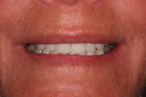 6 gamla plastfasader med inflammation i tandköttet pga dåliga skarvar. Behandling: Generell blekning samt 6 porslinsfasader.