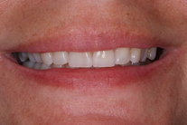 2 framtänder som står bakåttippade. Nötta av tandgnissling. Behandling: Inkorrigering av bettet samt 2 fasader.