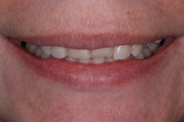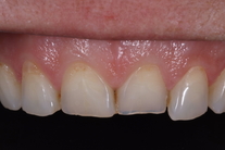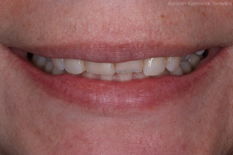 2 framtänder som står bakåttippade. Nötta av tandgnissling. Behandling: Inkorrigering av bettet samt 2 fasader.