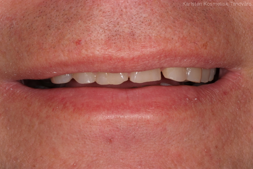 Slitna tänder generellt. Behandling: Blekning samt 8 kronor i överkäken samt 6 kronor i underkäken.