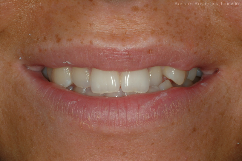 Ojämna framtänder med avvikande position och form. Behandling: 10 fasader i överkäken.