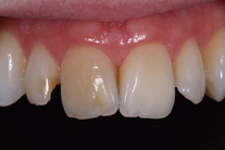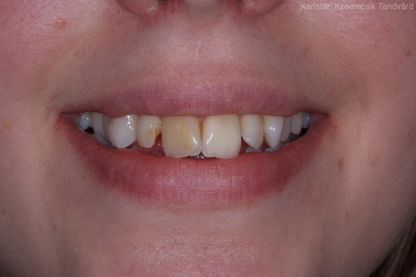 Missfärgade, trasiga framtänder. Behandling: Generell blekning samt 4 fasader.