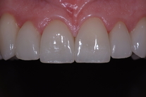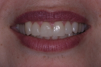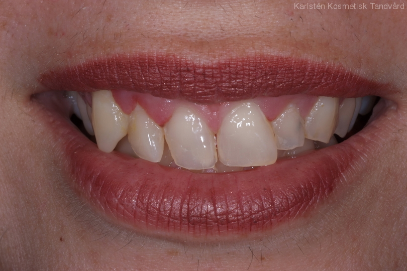 Kraftigt nergnisslade tänder. Behandling: Generell blekning, laserkonturering samt 21 porslinständer.