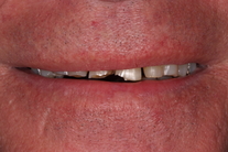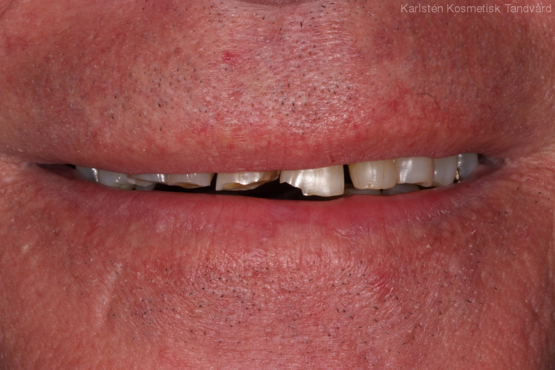 Kraftigt slitet och gnisslat bett. Behandling: 10 porslinskronor i överkäken.