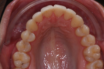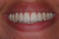 Ung kvinna som tidigare haft tandreglering. Upplever inte att tänderna står i en fin tandbåge. 11 månaders behandling med genomskinliga Invisalignskenor resulterade i ett fint leende.
