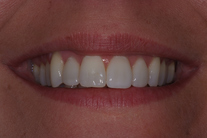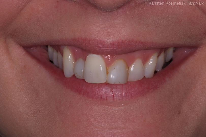 30-årig kvinna med oregelbundna tänder. Behandlingen består av 11 månaders tandreglering med genomskinliga Invisalignskenor, generell blekning samt 3 porslinsfasader.